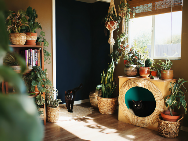 If you’re a plant parent, tuck the litter box behind a cluster of tall, leafy plants. Think Boston ferns, bamboo palm or even a faux tree. Just make sure your cat has an easy entry path, and keep the plants kitty-safe.